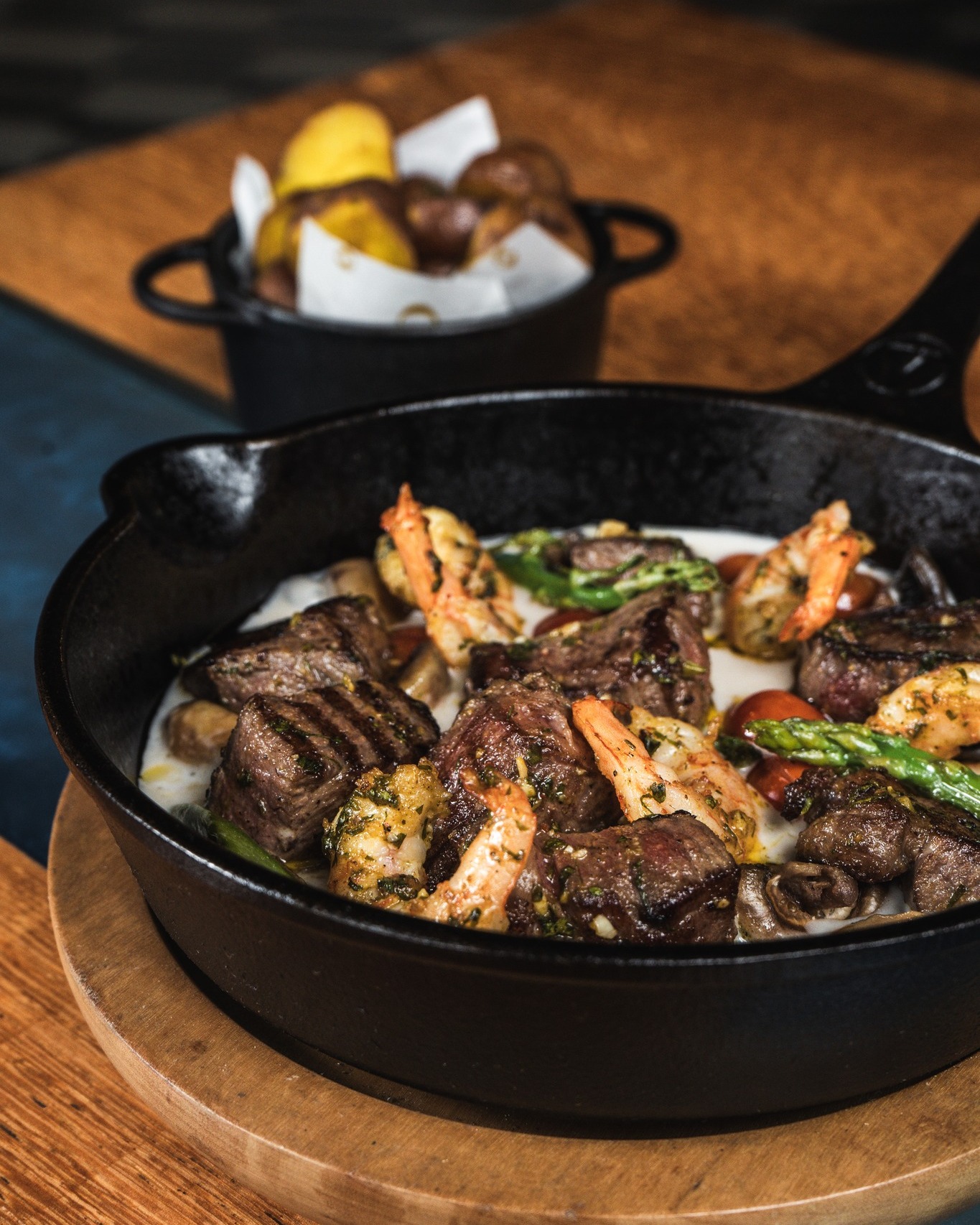 Bife americano con salsa de cava, hongos y espárragos aromáticos.