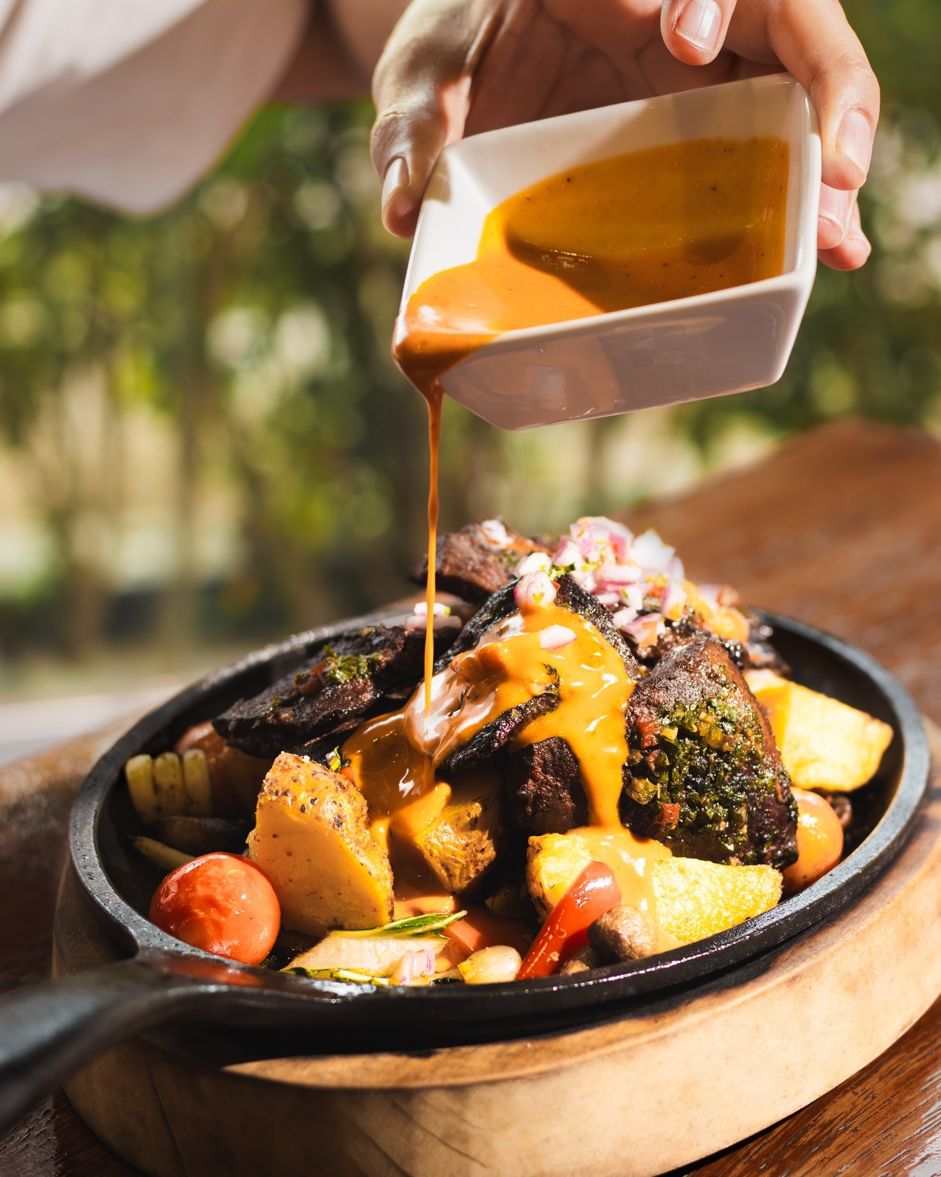 Corazón de res a la parrilla sellado y dorado, con papas crocantes y choclo salteado en mantequilla.