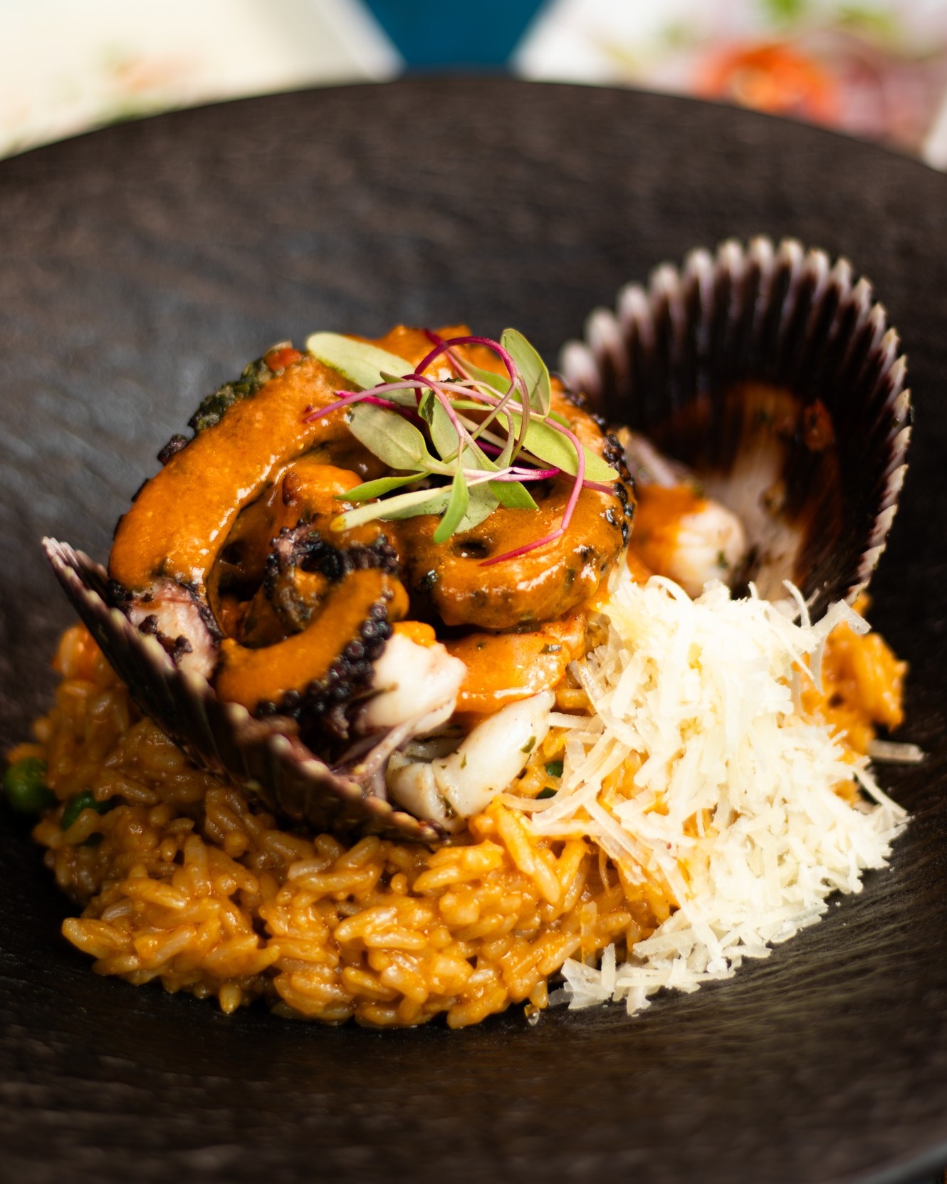 Clásico con toque Guargüero. Arroz cremoso, contundente y lleno de mar, coronado con una generosa mixtura de mariscos frescos.