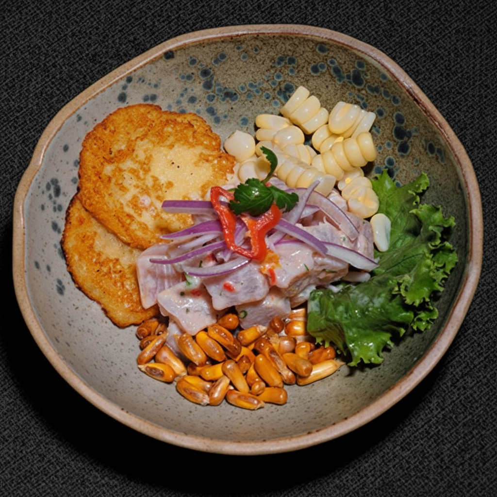 Frescura en cada bocado. Pesca del día, maíz chulpi y torrejas de choclo.