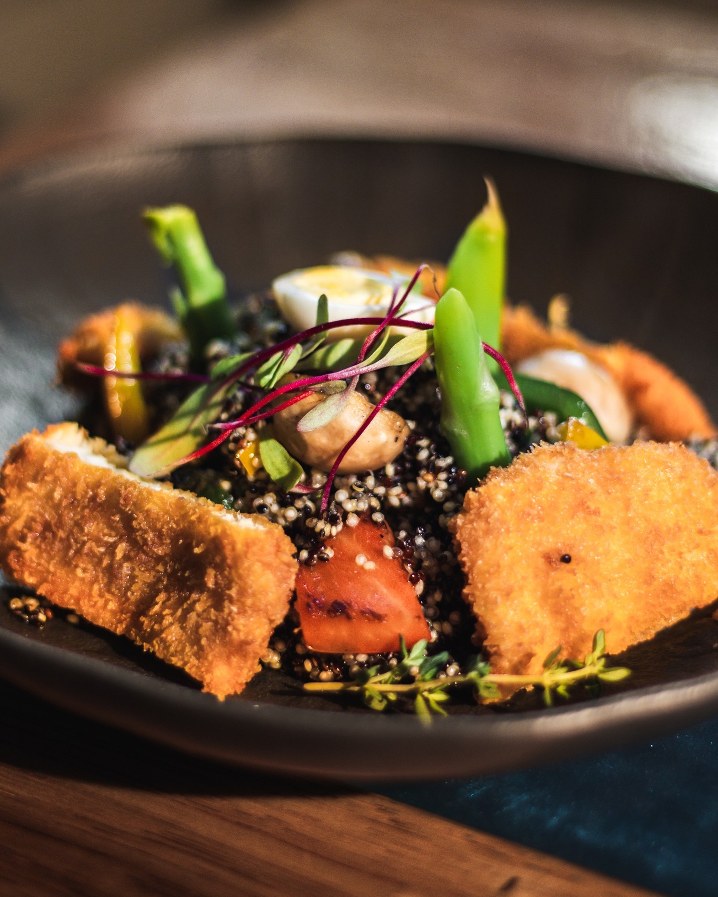 Quinua con pollo crocante, verduras de estación y un aliño especial de la casa.