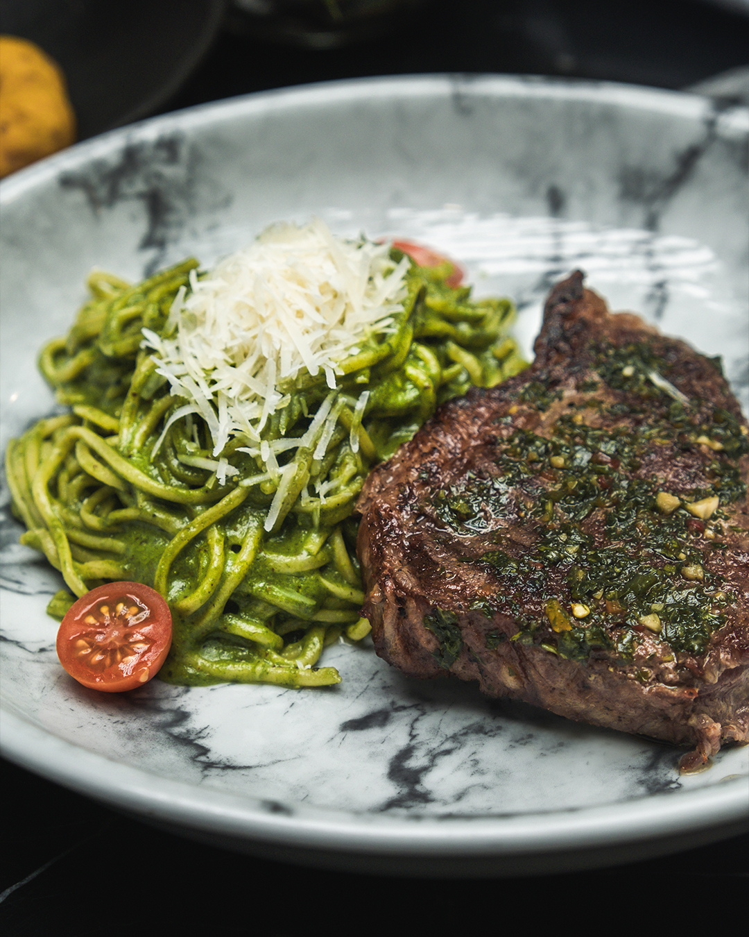 Pasta cremosa con pesto casero, coronada con un jugoso bife Angus a la parrilla.