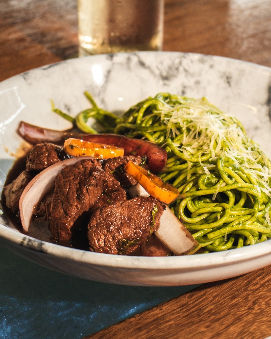 Pasta cremosa con pesto casero, con lomo fino, queso parmesano y tomate cherry.
