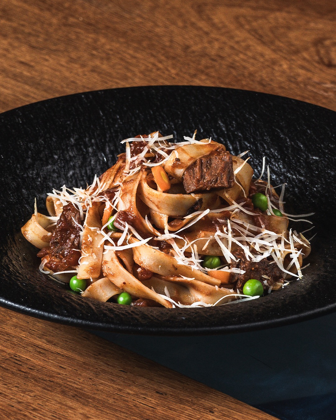 Pasta al dente en una rica salsa de estofado criollo, con trozos de carne de res y parmesano rallado.