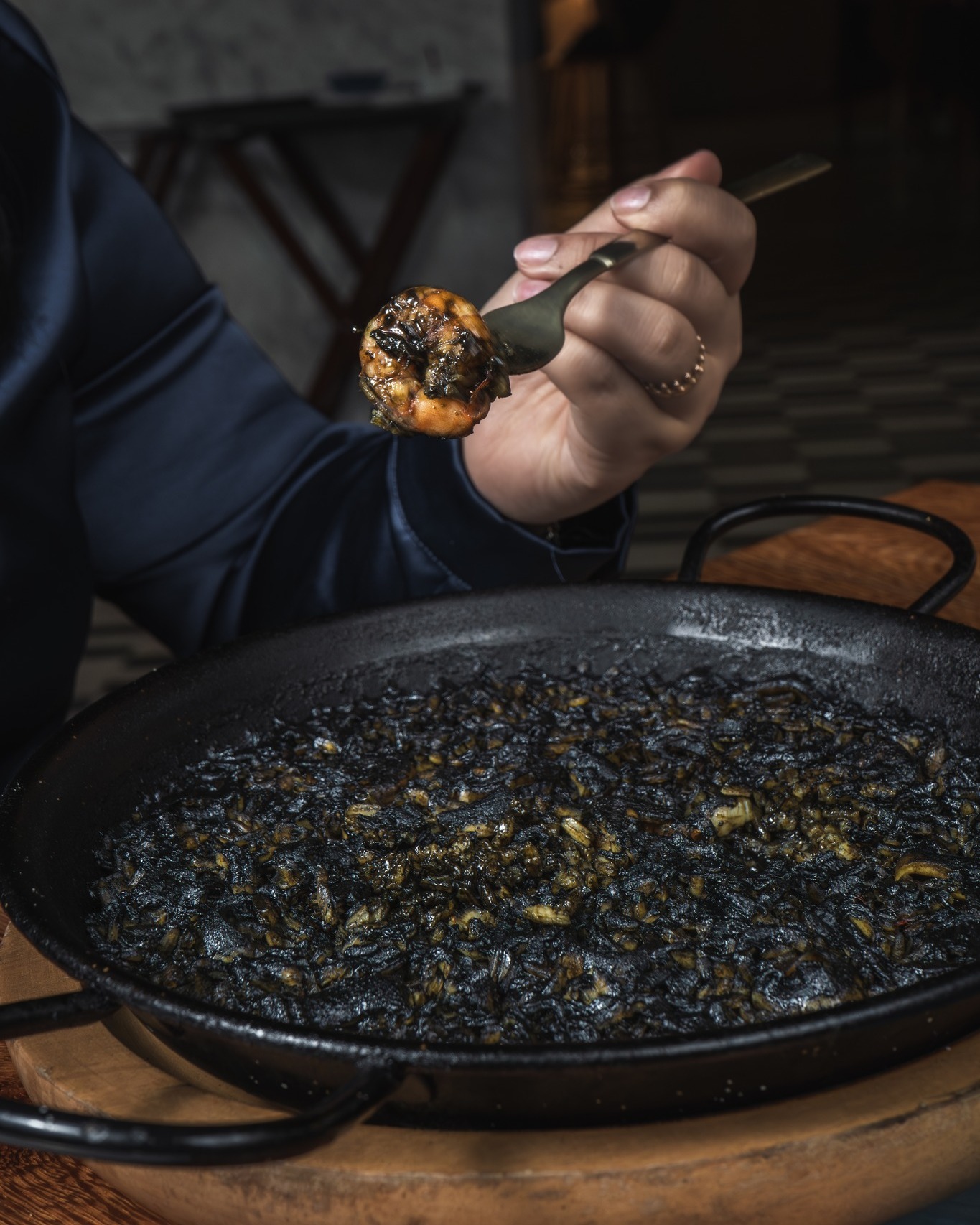 Arroz nacarado en tinta de calamar, conchas, langostinos y anillos de calamar.
