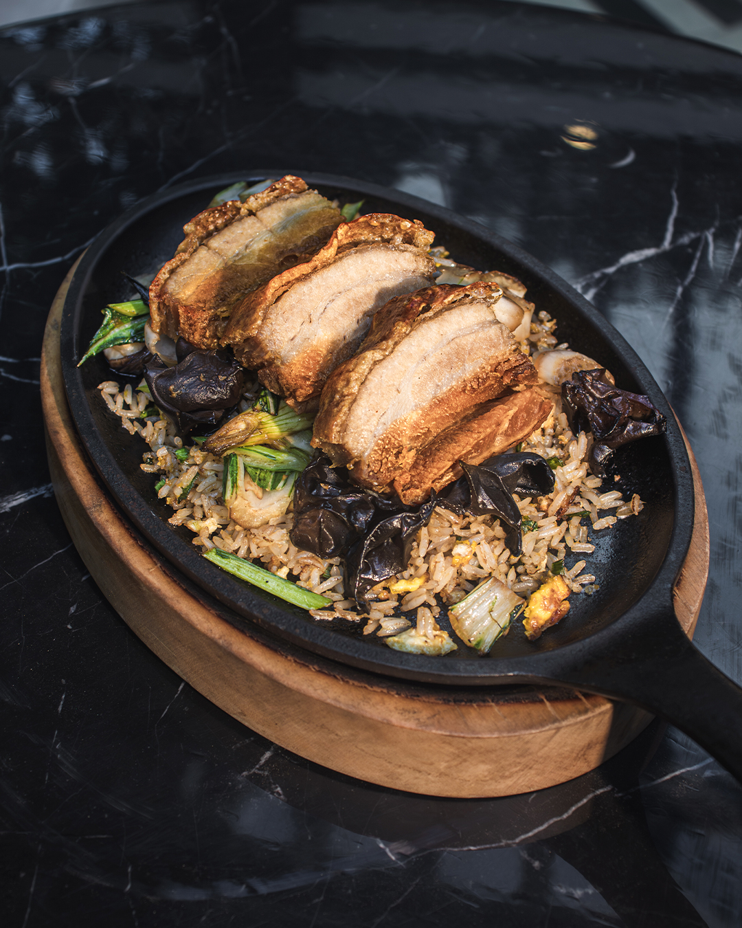 Corte jugoso con piel crujiente, sobre arroz chaufa blanco, toque de tamarindo y hierba luisa.