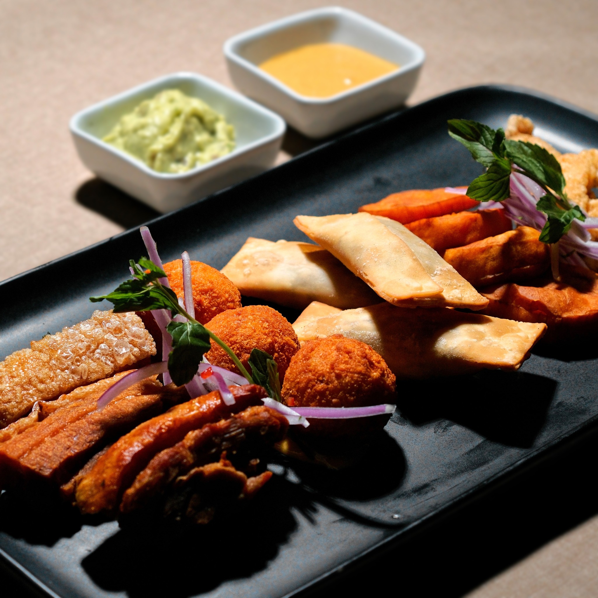Un festín peruano. Chicharrón crocante, anticucho jugoso, croquetas de yuca, cecina dorada y tequeños de lomo.