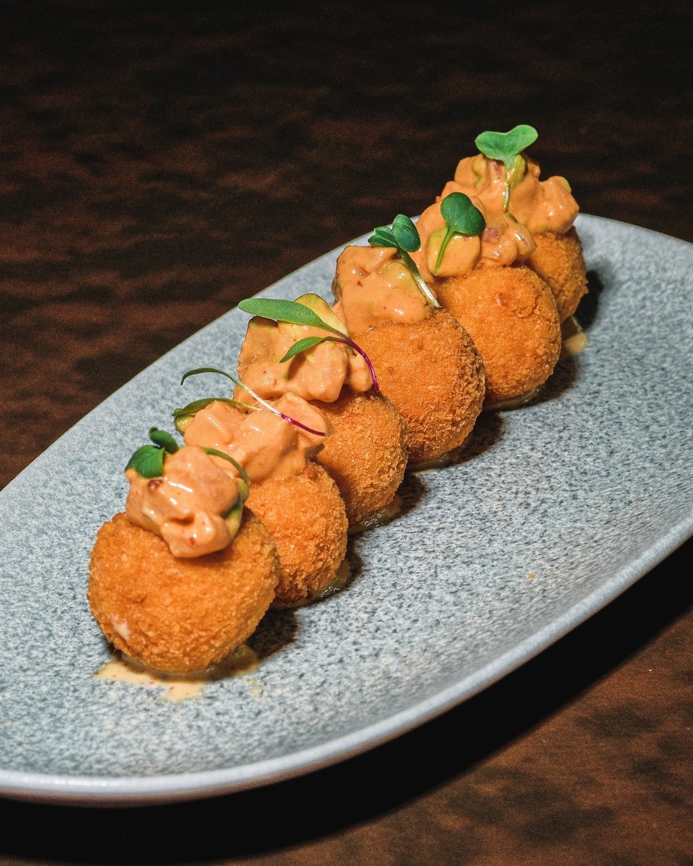 Del bosque peruano. Croquetas de yuca y cecina, con alioli ahumado y tartar de salmón.
