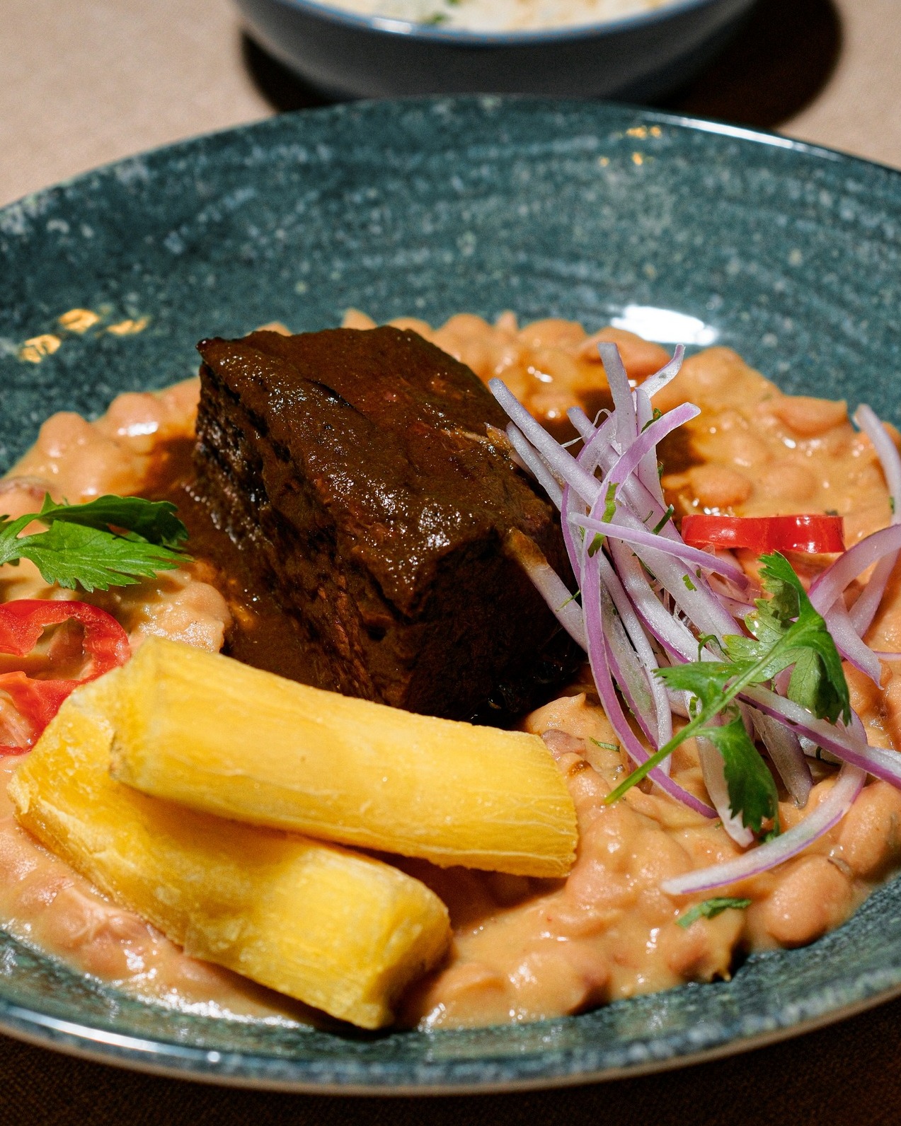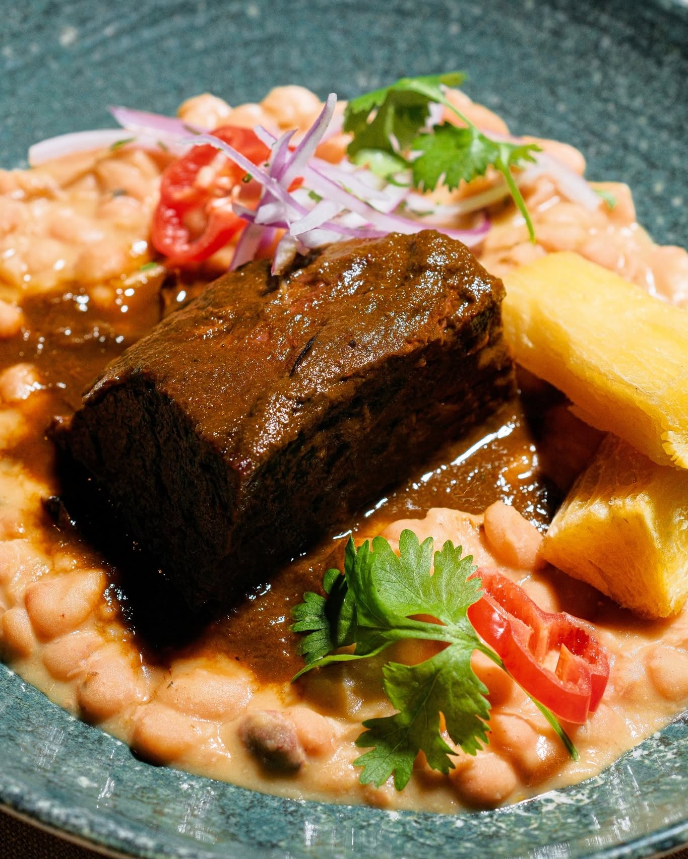 Tradición y sazón. Guiso de res con loche, chicha de jora, frejoles y criolla con ají limo.
