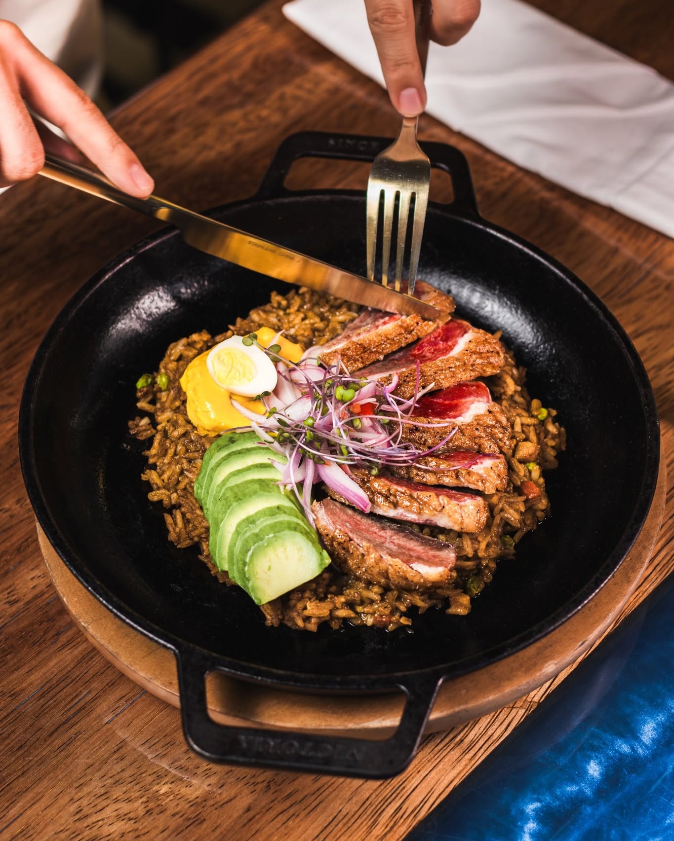 Chiclayo en tu plato. Arroz verde, loche y magret a la parrilla.